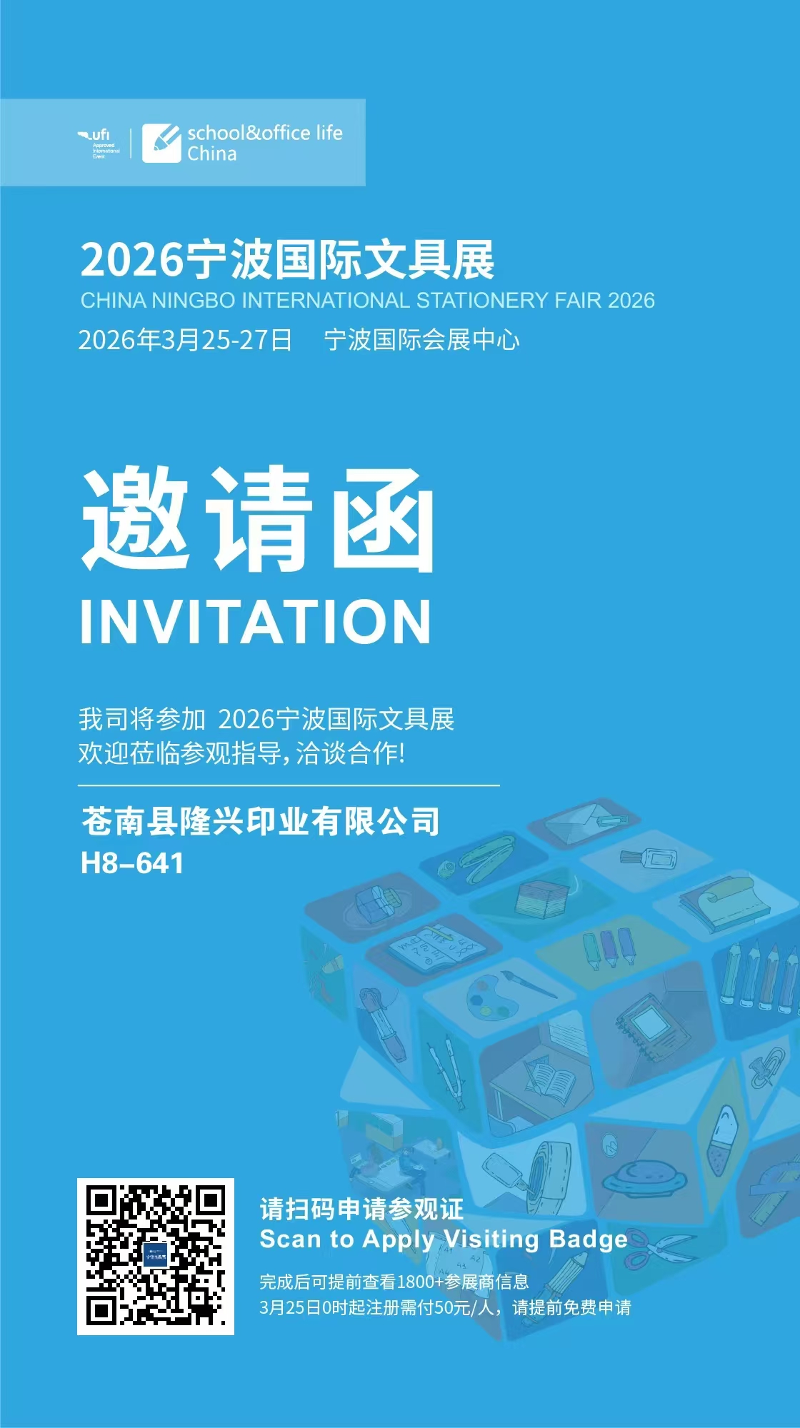 苍南县龙兴印刷有限公司很高兴地宣布参加 2026中国宁波国际文具博览会 ,发生于 2026年3月25日至27日 ,在 宁波国际会展中心 .